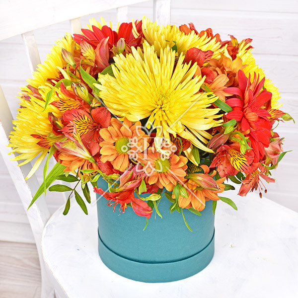 хризантема желтая одноголовая  - 5 шт., хризантема оранжевая кустовая – 3 шт., альстромерия красная – 5 шт., гербера красная – 3 шт., зелень декоративная, оазис, коробка.